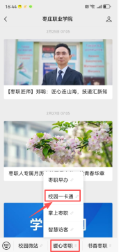 1、微信关注公众号:“枣庄职业学院”,选择“暖心枣职”,点击“校园一卡通”。或者搜索微信公众号“安校易云”点击一卡通点击首页