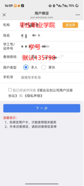 2、输入个人信息:姓名、学号、一卡通密码(默认135790)。选择手机号码, 允许授权点击右上角完成完成绑定。