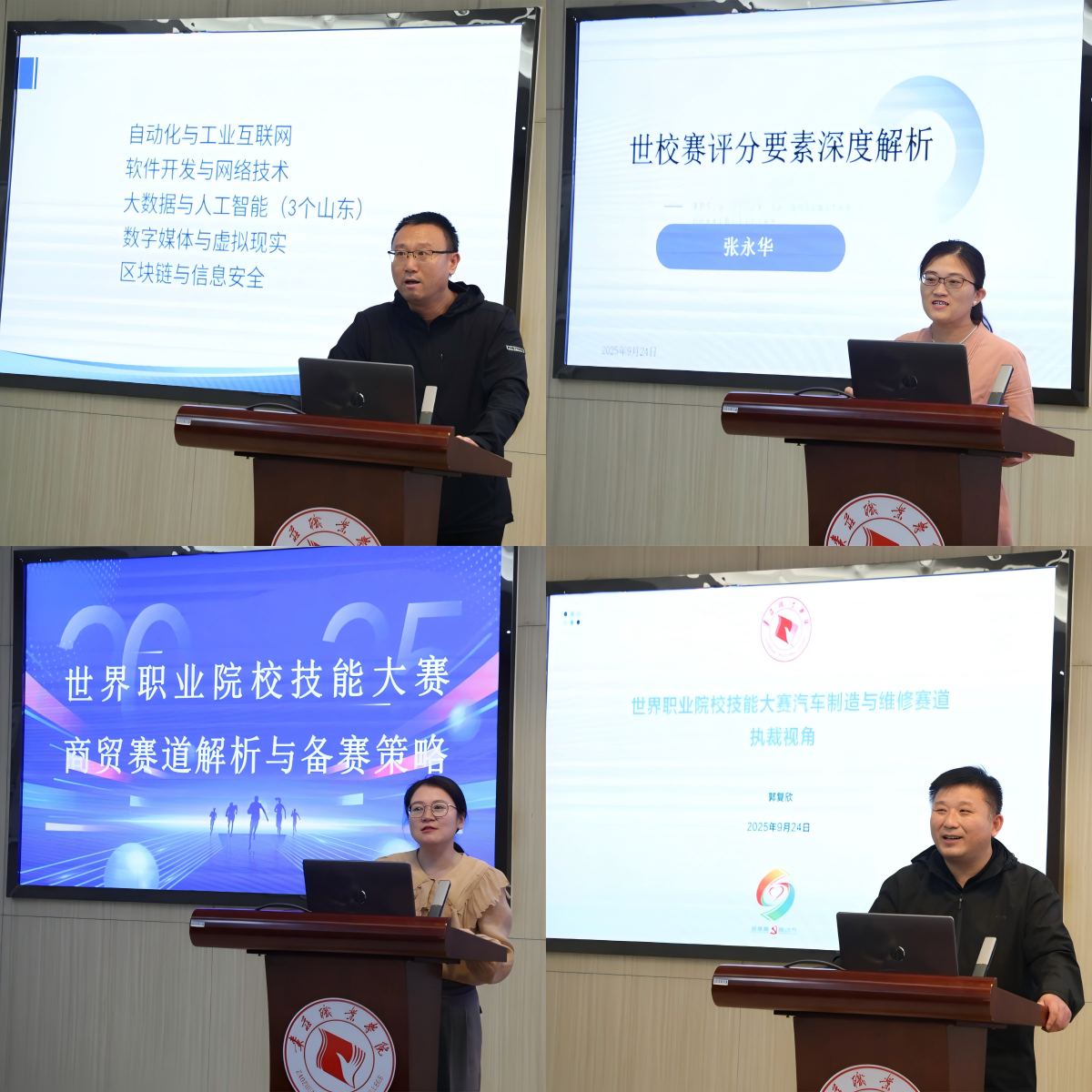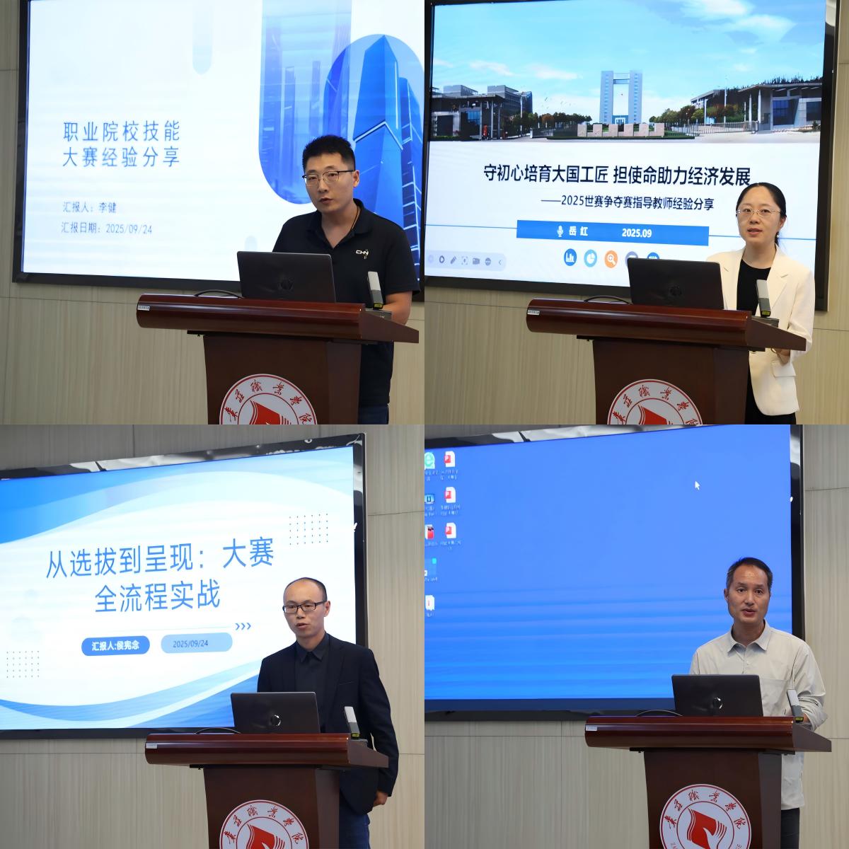 会上,学院四名曾担任世校赛裁判的教师从评审视角出发,围绕新赛制评分标准展开深度剖析。通过拆解典型失分案例,逐一梳理技术规范、操作流程等核心得分点,帮助参训教师厘清备赛重点与方向。随后,在2025年世校赛中获奖的赛项指导教师依次登台分享备赛经验。他们结合实战经历,从训练计划制定、学生心理调适到临场应变技巧,全方位解析备赛全流程,为参训者提供了可借鉴的“实战指南”。