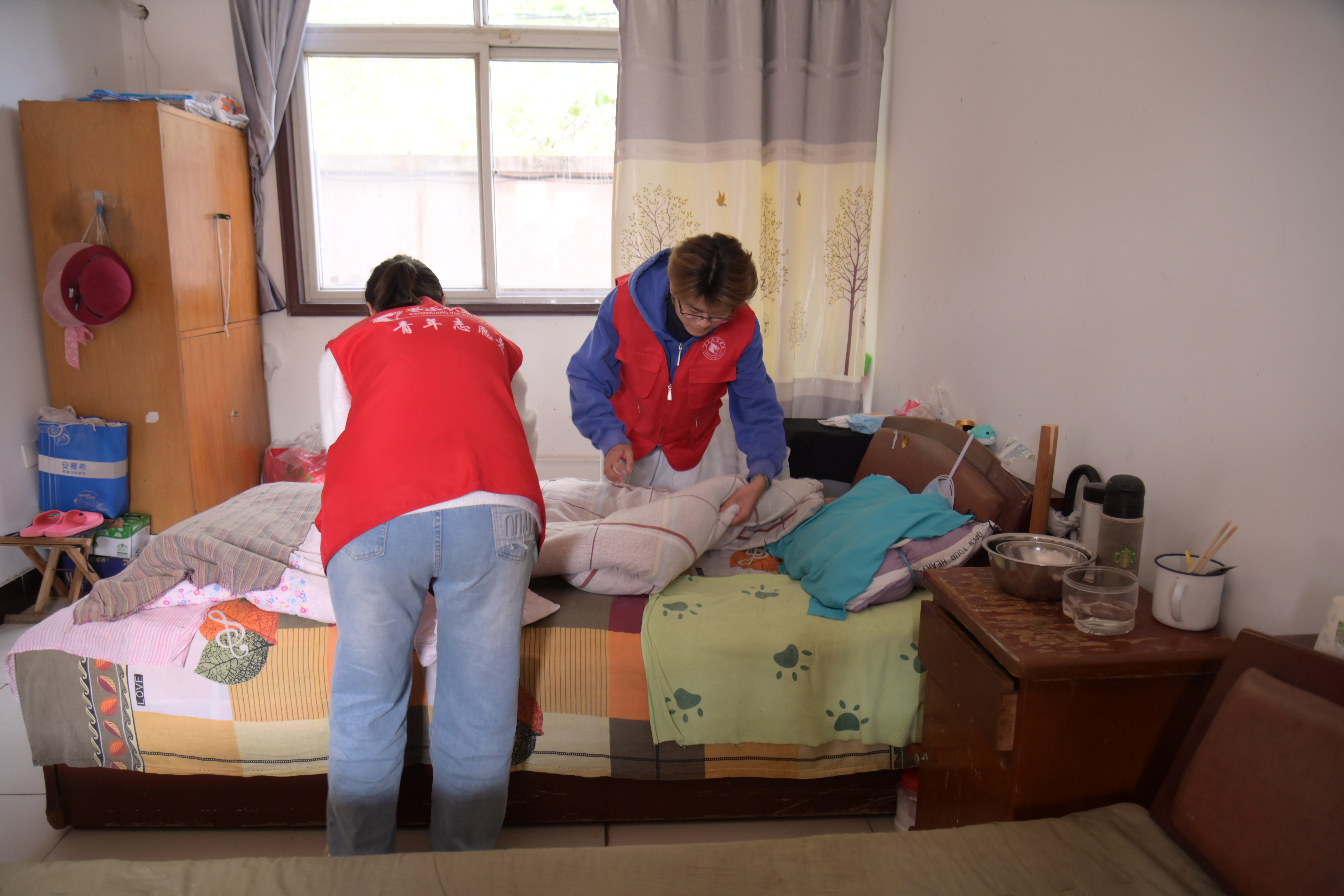 活动伊始,志愿者将精心准备的生活物资与营养品送至老人手中,每份物资都承载着对长辈的关怀。随后,庭院变身临时“小舞台”,志愿者们带来了一场热闹的文艺互动,老人们跟着熟悉的旋律轻声哼唱,跟着节奏拍手附和,笑声与掌声交织,温馨氛围弥漫整个庭院。活动尾声,志愿者们两人一组结对行动,帮老人叠被子、整理衣物,或者围在老人身边,倾听他们讲述过去的故事,用耐心陪伴化解老人的孤独。