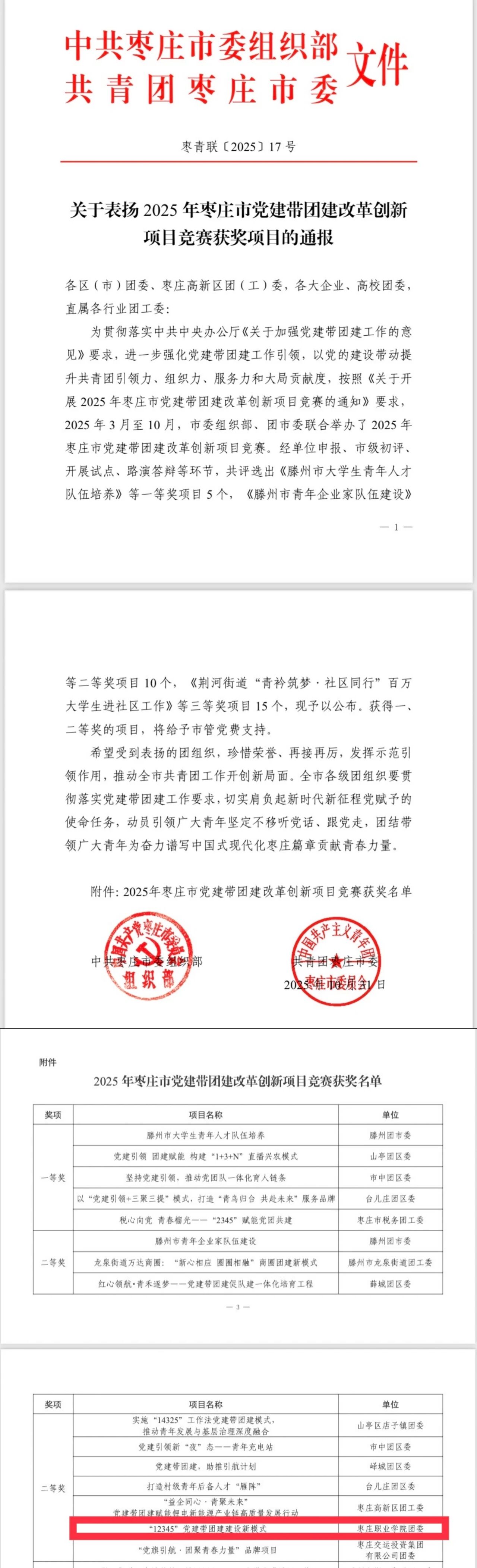 近日,由市委组织部、团市委联合举办的枣庄市2025年党建带团建改革创新项目竞赛结果公布,学校申报的“12345”党建带团建建设新模式凭借鲜明特色、扎实成效和创新价值,从众多参赛项目中脱颖而出,荣获竞赛二等奖,彰显了学校在党团共建领域的探索成果。