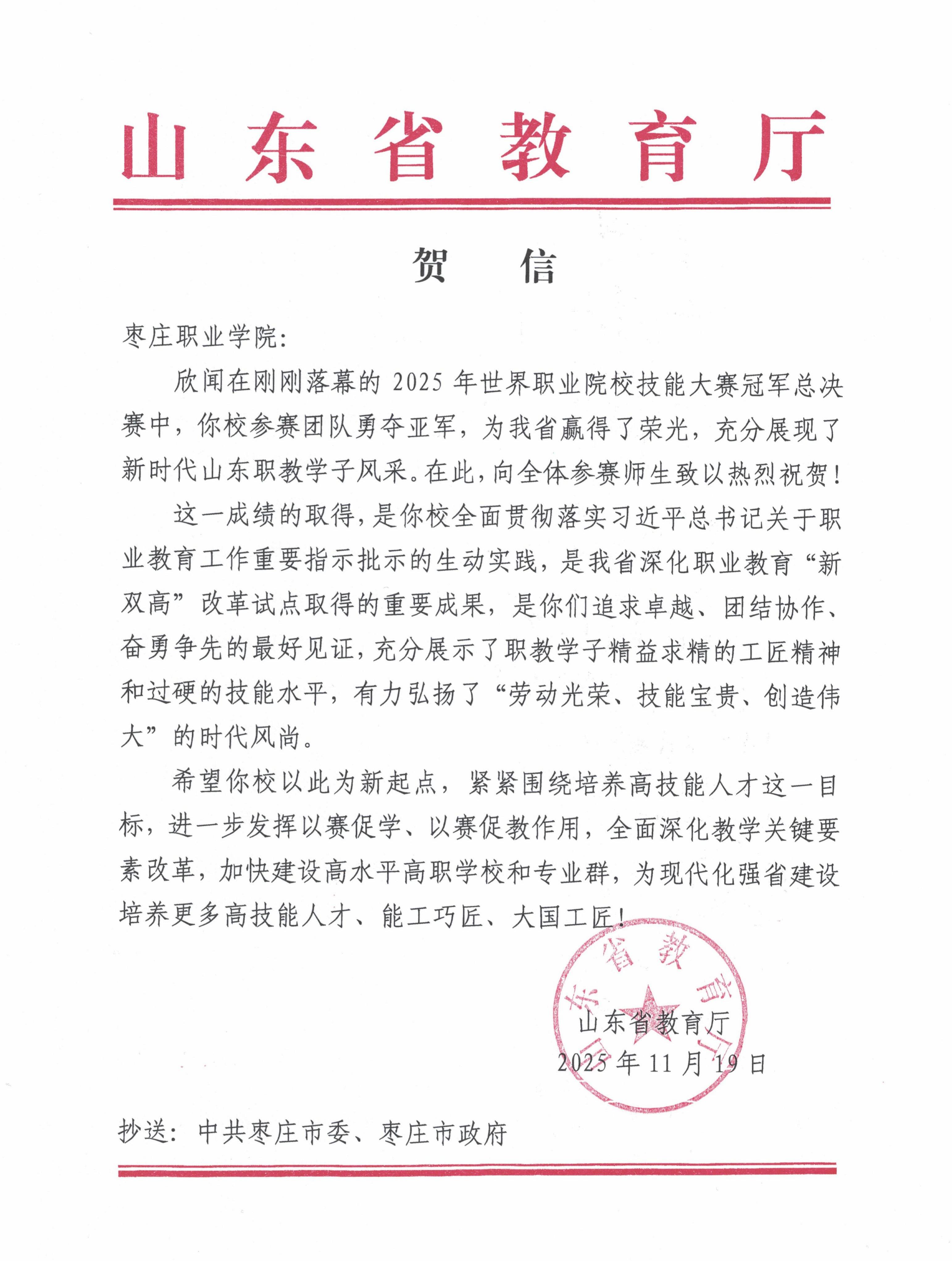 11月14日,2025年世界职业院校技能大赛冠军总决赛在天津落下帷幕,枣庄职业学院代表队在76个国家的8956支队伍中脱颖而出,凭借参赛项目《数智驱动智慧生产赋能区域高端化工产业发展》,荣获总决赛亚军!山东省教育厅给我校发来贺信表示祝贺,全文如下: