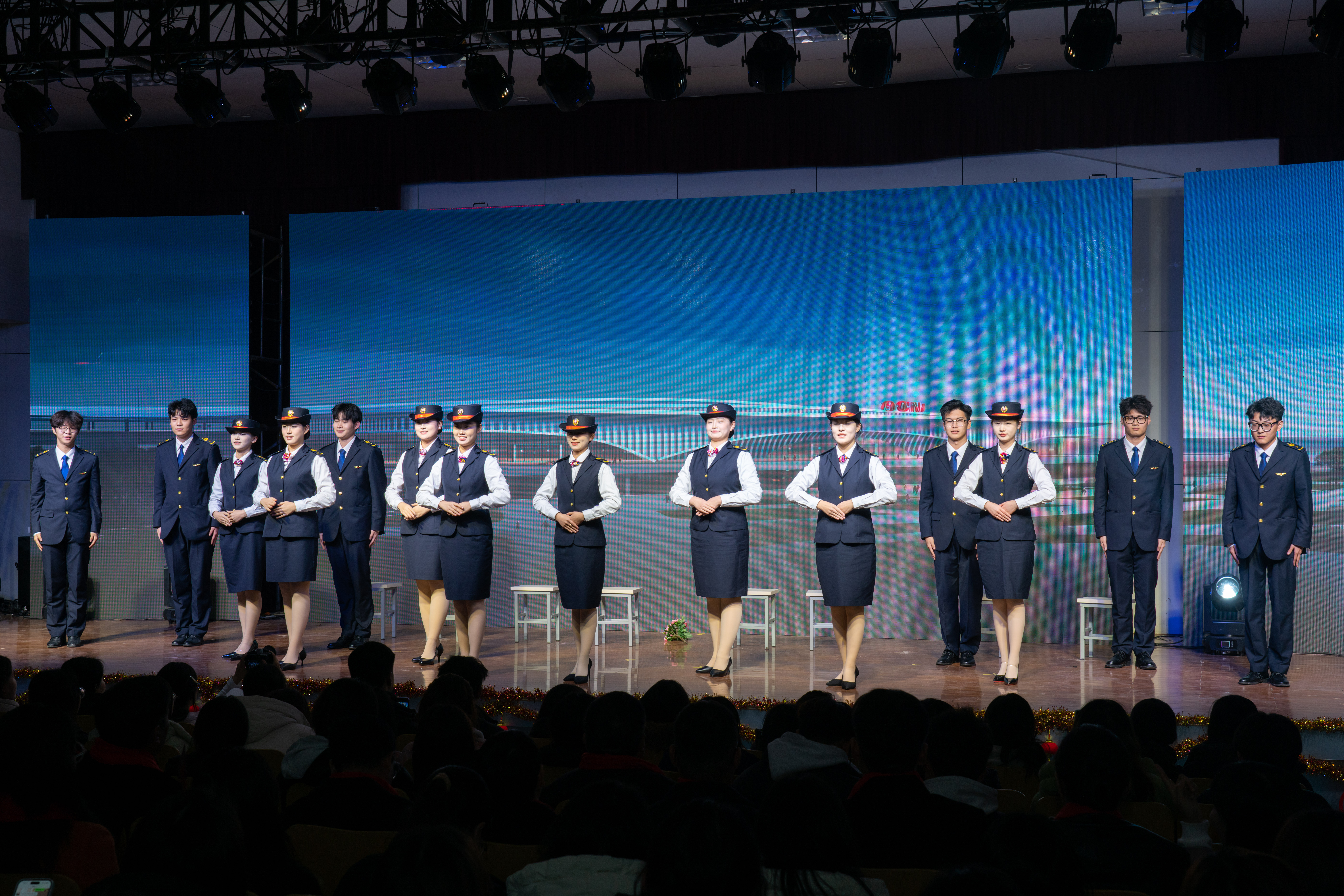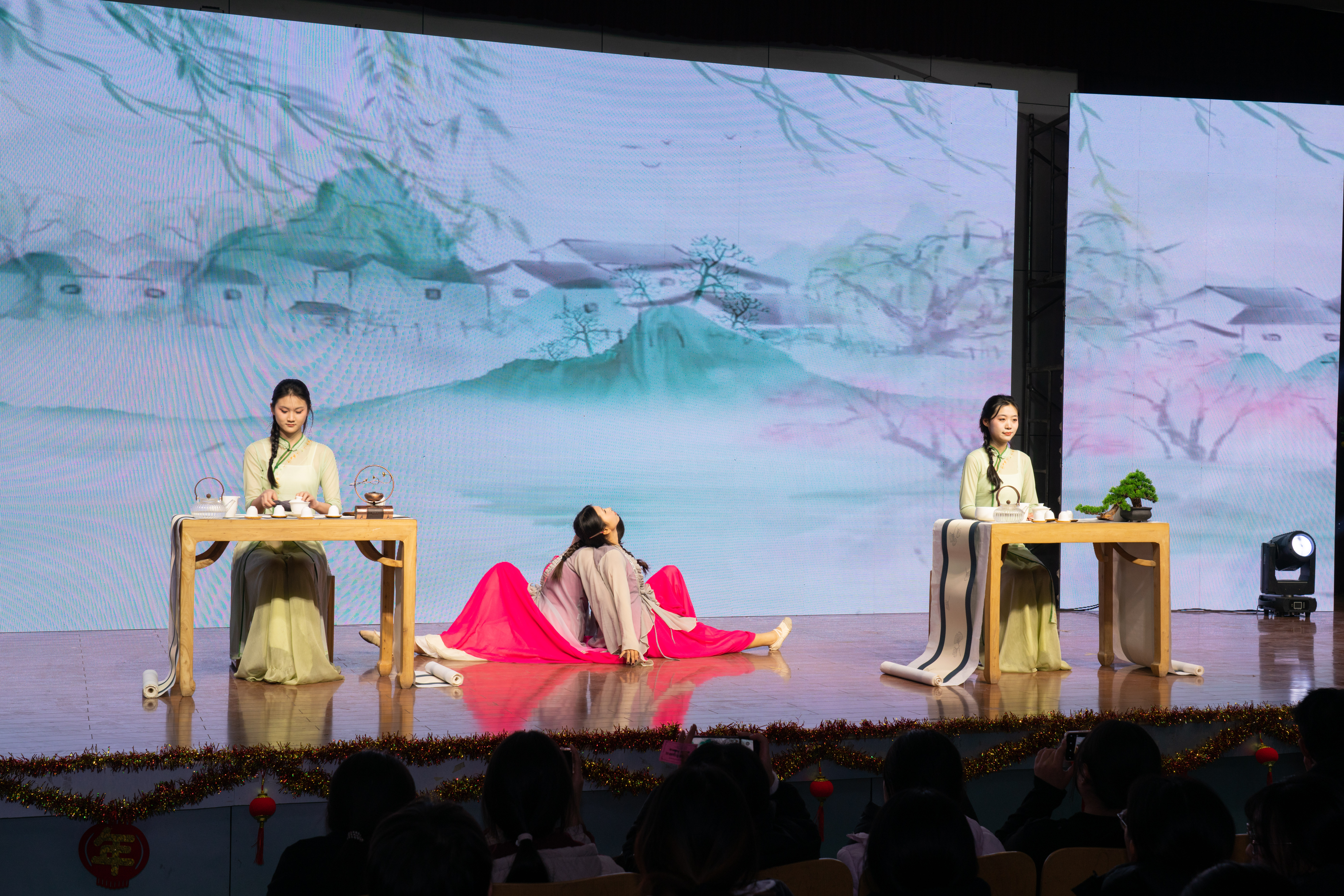 茶艺表演《胭脂妆》独具韵味,将茶文化与国风之美完美融合,茶师指尖起落间,杯盏流转,茶香氤氲,让观众在静心欣赏中感受东方文化的清雅风骨;大合唱《小美满》温暖治愈,用清澈的歌声描绘出生活中的小幸福,传递出满满的正能量。古典舞串烧意境唯美,舞者们身着古典服饰,舞姿曼妙,将古典艺术的韵味展现得淋漓尽致;《高铁礼仪show》规范标准、身姿挺拔、仪态优雅,彰显了专业学子扎实的专业素养和良好的精神风貌;歌曲《武家坡》将传统戏曲与现代歌声相结合,重现了薛平贵与王宝钏的千古佳话,独特的表演形式令人耳目一新;小品《女人N次方》《妈呀,新老师》幽默风趣,贴近生活,引发了观众的强烈共鸣,现场笑声不断。