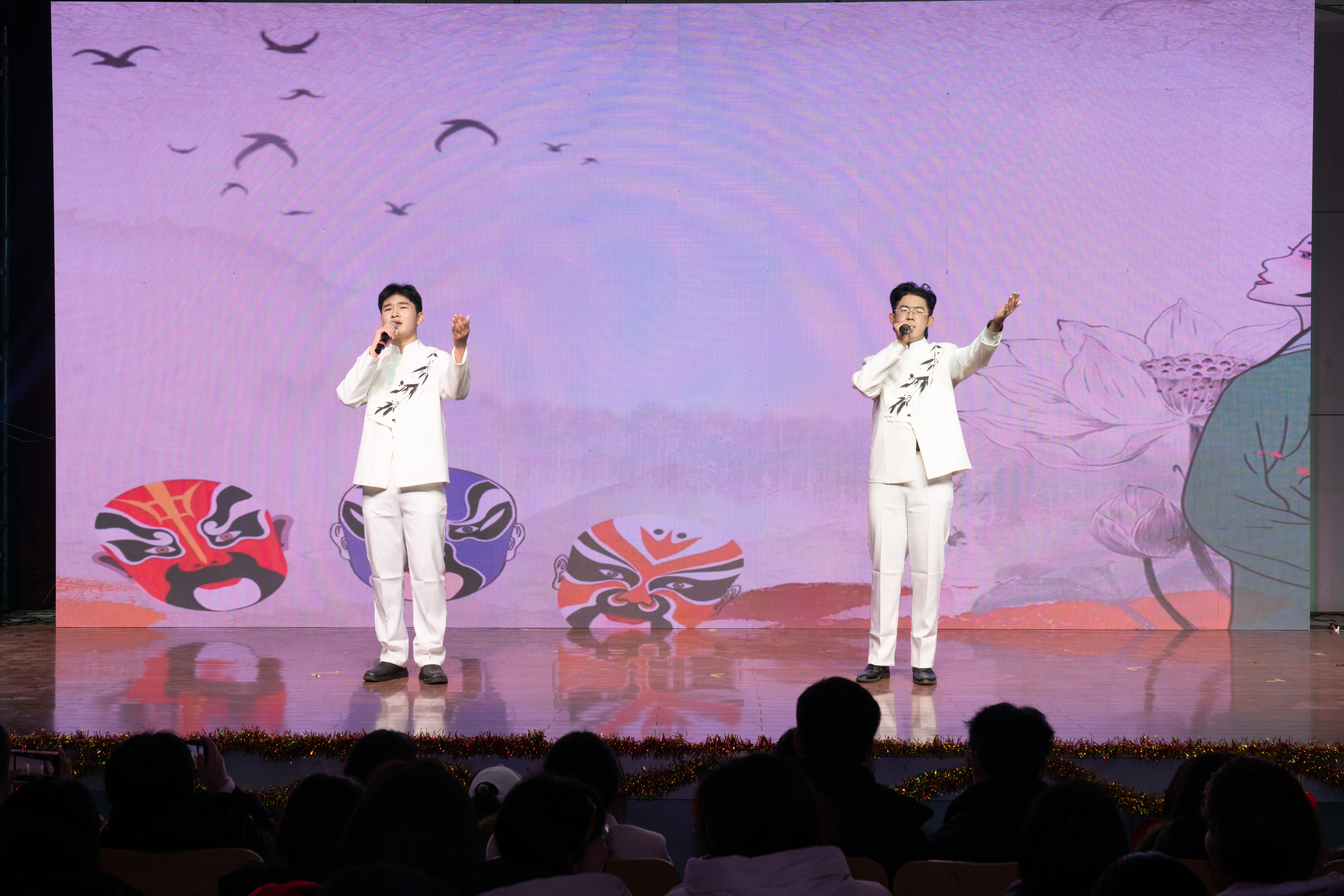 随后,精彩纷呈的节目轮番上演,为观众呈现了一场高品质的艺术盛宴。歌曲《青丝》婉转悠扬,用细腻的情感诠释了青春的情愫;相声《四大名著》创意十足,将经典文学与幽默表演相结合,让观众在欢声笑语中领略传统文化的魅力;爵士舞表演活力四射,舞者们用灵动的舞姿展现了青春的张扬与自信;励志歌曲《海阔天空》充满力量,传递出追逐梦想、无畏前行的信念。