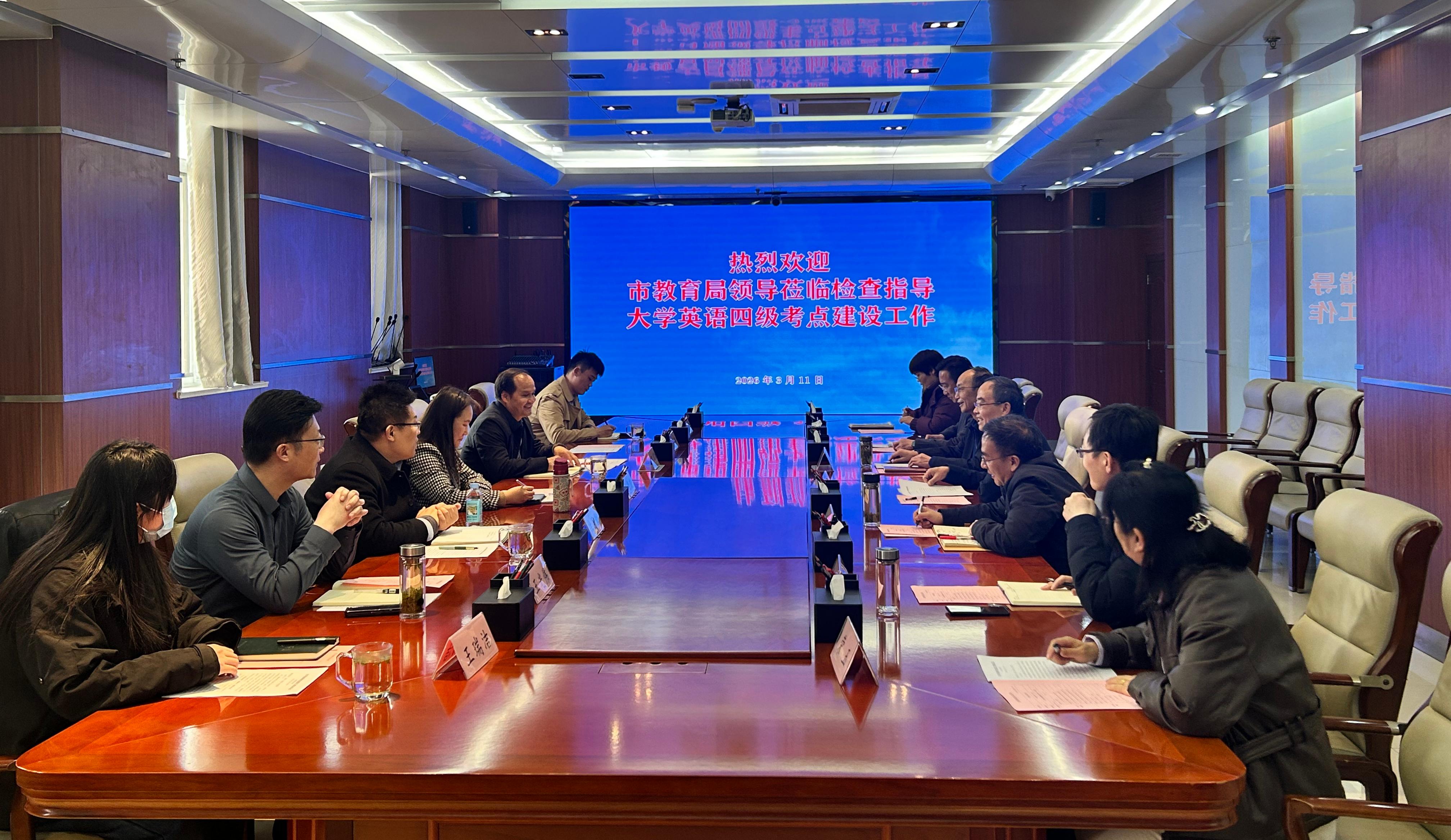 3月11日,市教育局副局长梁梦晓一行莅临我院,就大学英语四级考点建设工作进行检查与指导。学院党委书记郝荣平,党委副书记、院长梁家和,党委委员、副院长刘希震,以及教务处等相关负责人陪同检查并参加座谈。