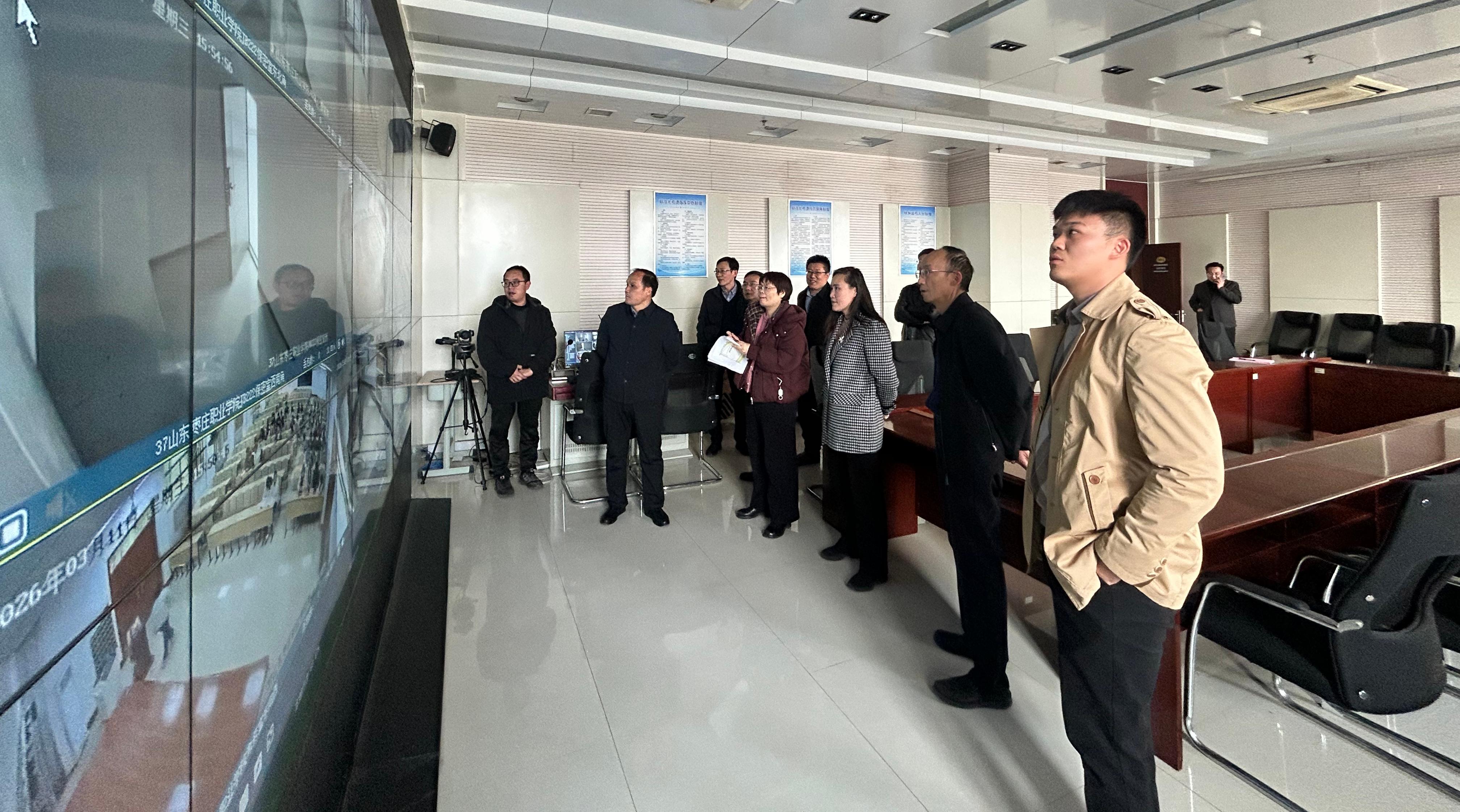 梁梦晓一行实地考察了保密室、监控室和听力播音设备等考场硬件设施,细致询查了考点软硬件配置、考务工作安排等落实情况,对学院全国大学英语四口语考试考点建设工作给予了充分肯定。她结合考察情况提出三点指导意见,一要优化设施配置,完善考场硬件运维机制,确保设备性能稳定、技术防护严密;二要强化保密管理,完善应急机制,严格落实“人防、物防、技防、制度防”四防措施,筑牢考试安全防线;三要提升人员能力,组织专门的考务培训,确保每一位参与相关工作的人员合格上岗。